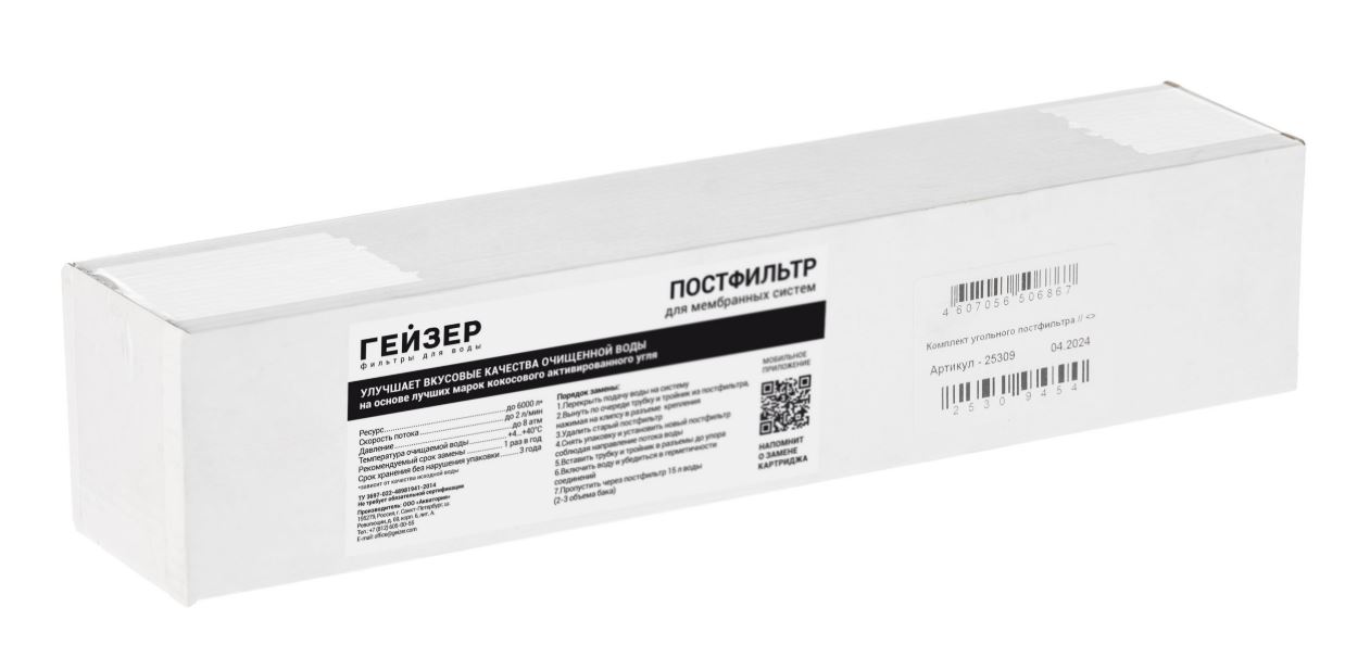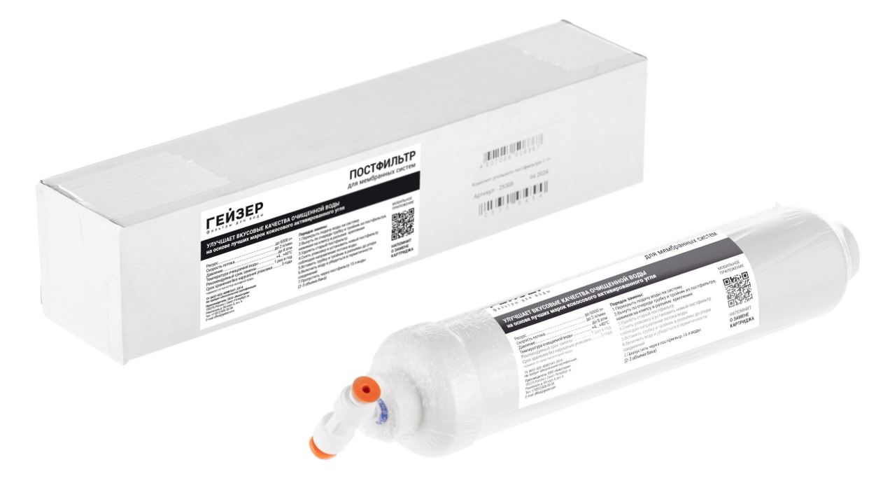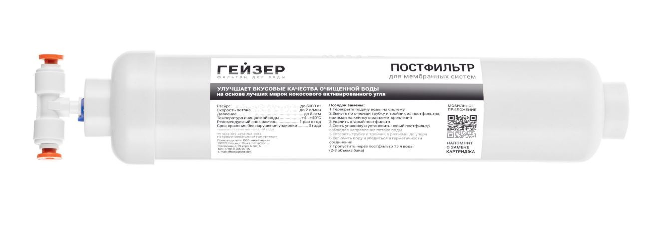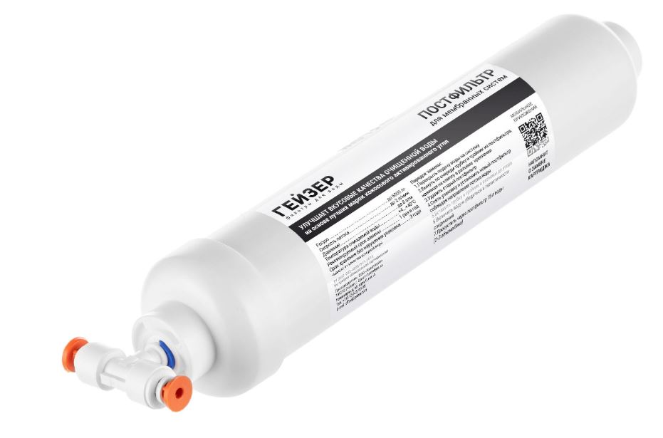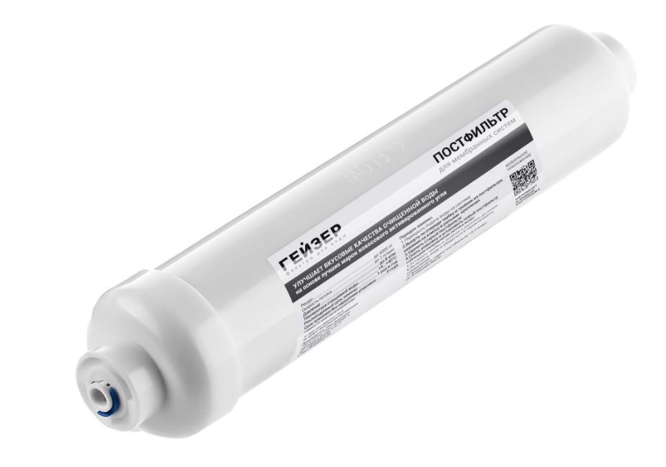 Является завершающим этапом очистки воды от посторонних запахов и привкусов, которые могут появиться при длительном ее нахождении в гидроаккумуляторе. Применяется в системах обратного осмоса Гейзер Престиж, Гейзер Аллегро и системе нанофильтрации Гейзер Нанотек и других системах.