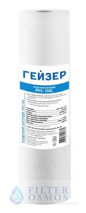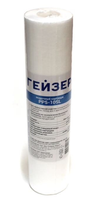 Предназначен для механической очистки воды от нерастворимых примесей. Вспененный полипропилен фильтрует воду от ржавчины, грязи, песка и других примесей размерами более 5 мкм. Использованный картридж не подлежит восстановлению и регенерации. После окончания ресурса требуется замена на новый.PP 5 - 10SL применяется в бытовых фильтрах Гейзер 3, Гейзер БИО, Гейзер Ультра БИО, в системе обратного осмоса Гейзер Престиж и в магистральном фильтре Гейзер 1П.