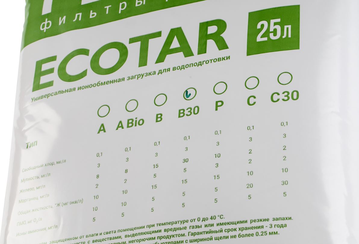 Экотар B30 - для удаления растворенного железа (до 30 мг/л), марганца и солей жесткости при незначительном содержании в воде органических веществ.