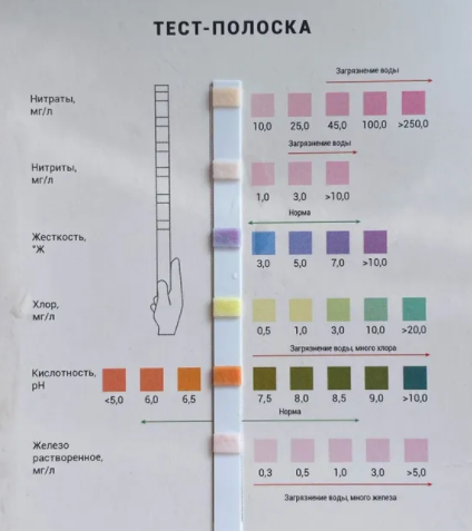 Экспресс-тест предназначен для экспресс-анализа воды (из централизованного водоснабжения, скважин, колодцев и других водоемов) на содержание в ней: нитратов, нитритов, жесткости общей, активного хлора, железа общего, железа растворенного, кислотности (pH), органических примесей (перманганатная окисляемость).
