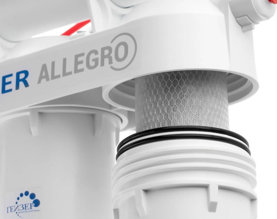 Технология обратного осмоса, использованная в фильтре Гейзер Аллегро, заключается в фильтровании воды через полупроницаемую мембрану. Размеры пор мембраны настолько малы, что пропускают только молекулы воды. Размер молекул большинства примесей, а также бактерий и вирусов значительно больше молекул воды, поэтому они не проходят через мембрану. Система работает при давлении в подводящей магистрали не менее 3 атм.