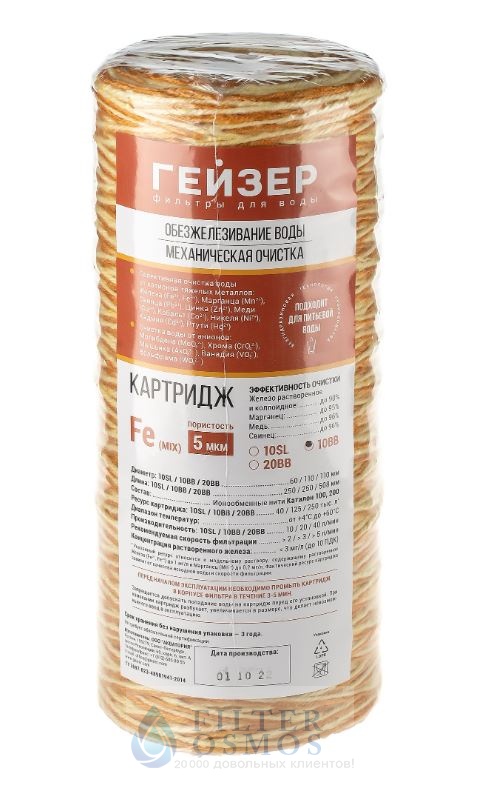 Картридж Fe-10BB (mix) обезжелезивающий используется в бытовых фильтрах Гейзер. Материалом изготовления служат катионообменный и анионообменный шнур. Фильтр эффективен в отношении растворенного и окисленного железа, марганца, а также дополнительно очищает воду от коллоидного железа. Ионы серебра в структуре картриджа предотвращают размножение микроорганизмов. По истечении ресурса картридж можно восстановить при помощи 2% уксусной кислоты.Рекомендуется при содержании растворенного железа до 2 мг/л.
