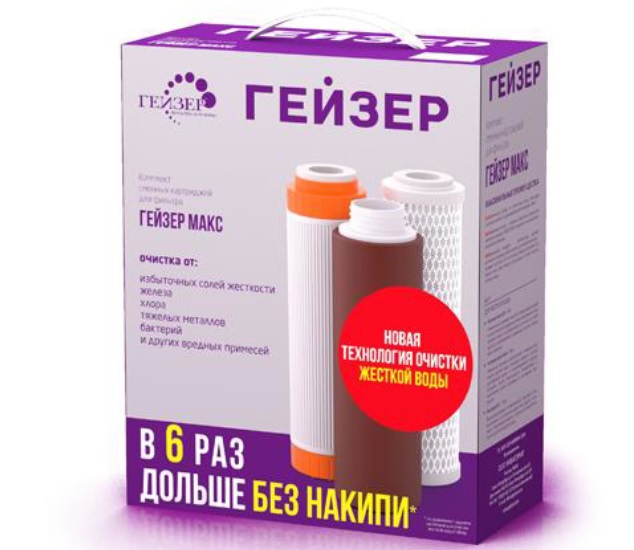 Комплект сменных картриджей № 17 для фильтра Гейзер Макс избавит Вашу воду от избыточных солей жесткости, железа, хлора, тяжелых металлов, бактерий и других вредных примесей. Новая технология очистки жесткой воды позволит в 6 раз дольше устранять накипь.