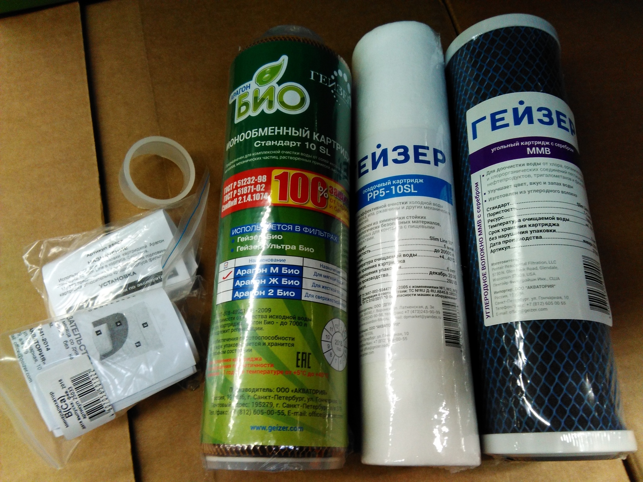1. Картридж РР - механическая очистка 2. Картридж Арагон-М БиО - комплексная очистка, обезжелезование, насыщен кальцием, защита от вирусов и бактерий