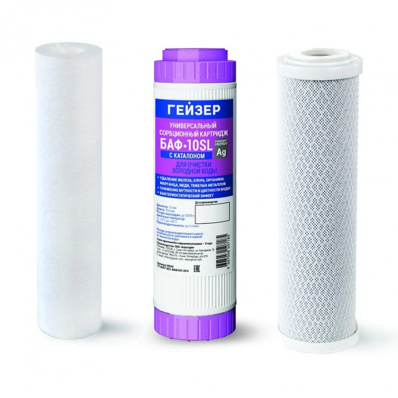 Предназначен для очистки и кондиционирования воды. Представляет собой сменный набор к фильтру Гейзер Стандарт или предфильтры для Гейзер Нанотек.