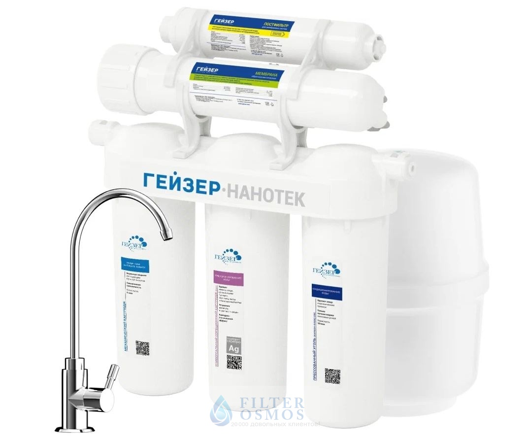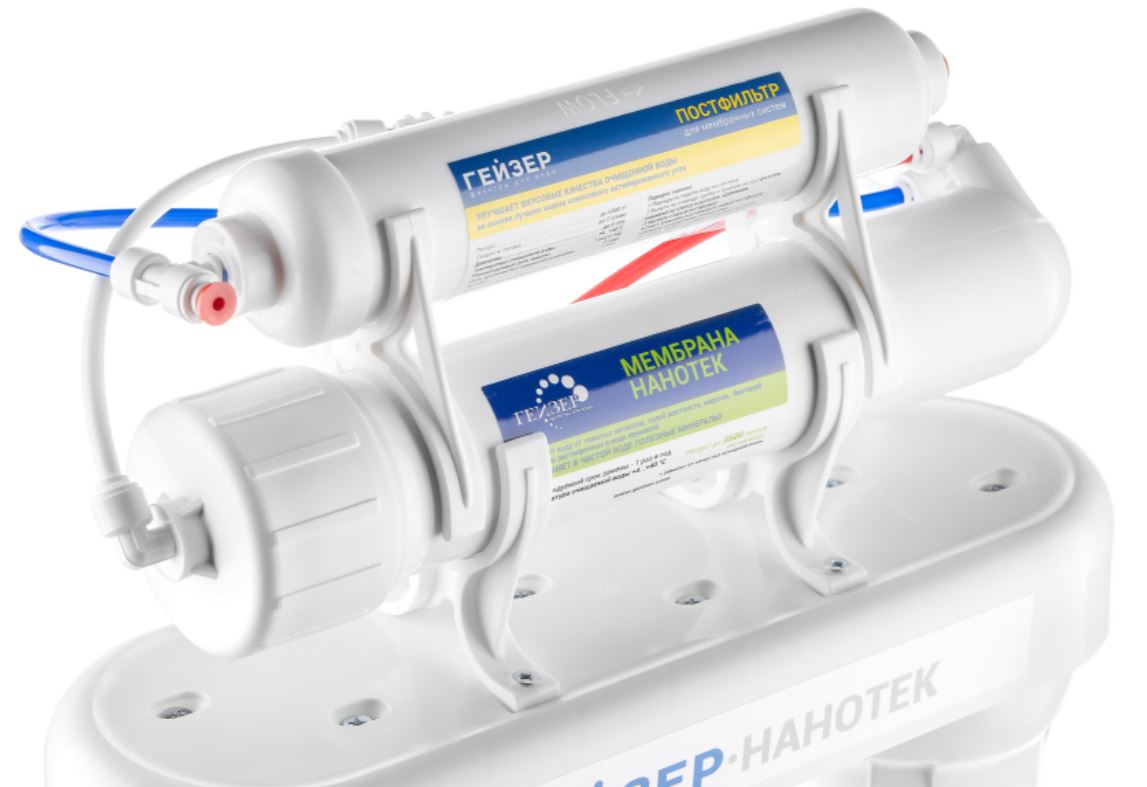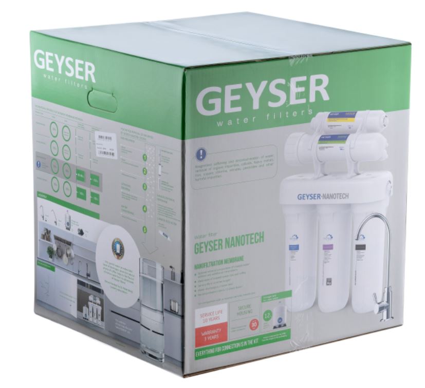 Гейзер Нанотек ― это мембранный фильтр, конструктивно схожий с системами обратного осмоса. Основным его отличием является мембрана. Размер её пор в 0,001 мкм находится посередине между порами обратноосматических и ультрафильтрационных мембран. Это позволяет получить воду высокой степени очистки, но в то же время избежать её полного обессоливания. Гейзер Нанотек способен снизить содержание солей жесткости в воде на 80%, что обеспечит отсутствие накипи в чайниках, а также защитит утюги, кофемашины и другую бытовую технику.