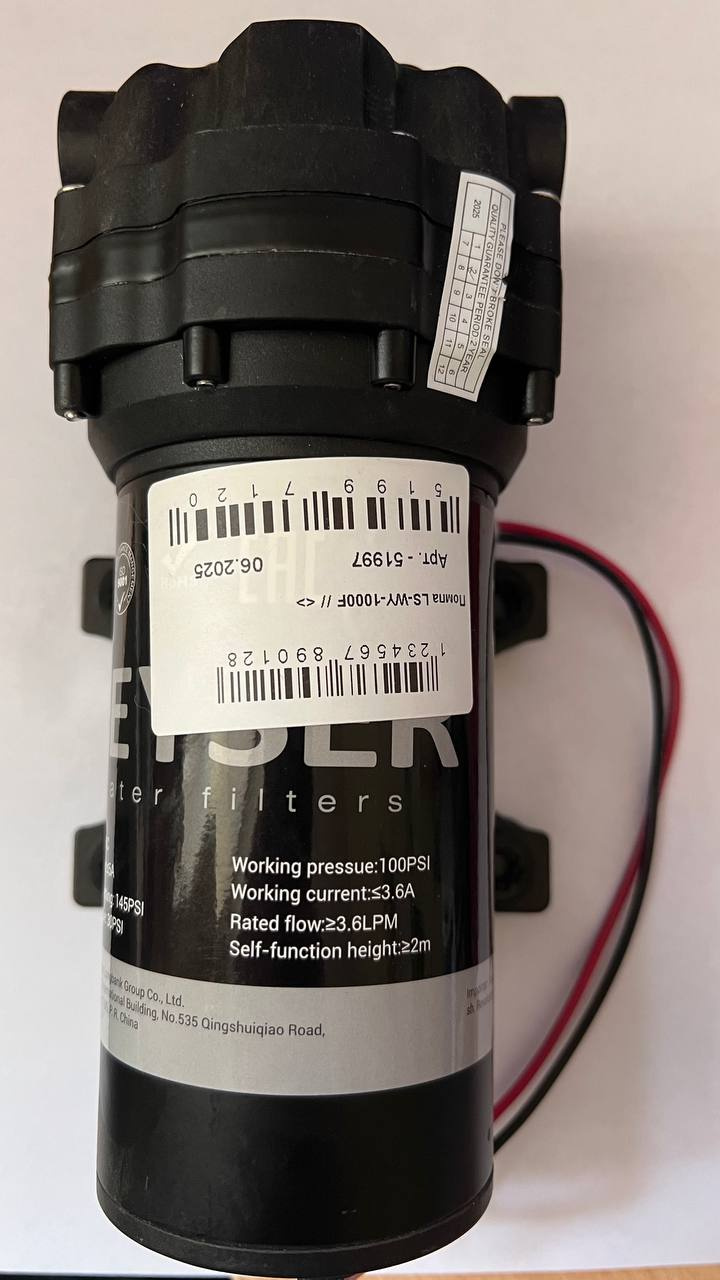 Устройство повышения давления (помпа) Гейзер помпа LS-WY-1000F для систем обратного осмоса. Номинальная производительность узла составляет 1000 галлонов воды в сутки (157,7 литров/час).