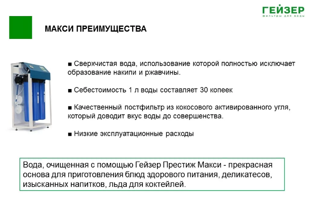 Система Гейзер Престиж Макси 1500 предназначена как для бытового применения, так и для небольших предприятий.