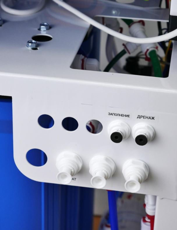- Основная очистка воды выполняется на 3-х обратноосмотических мембранах 3021 400 GPD. Пористость мембран 0.0001 мкм.