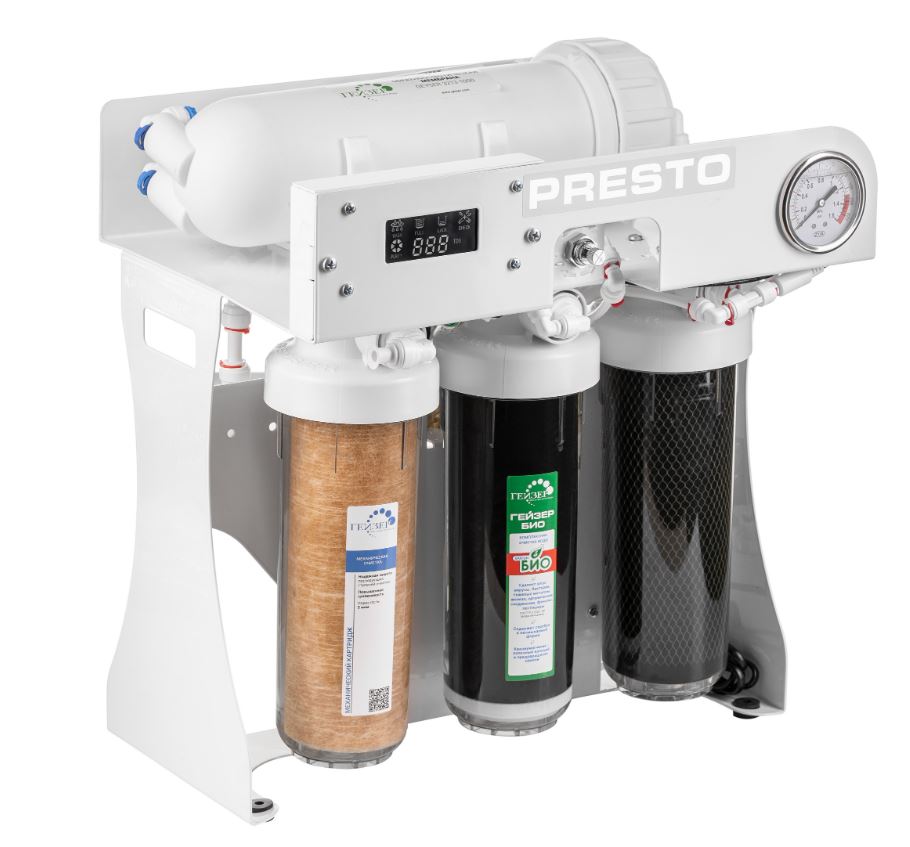 Гейзер Престо – система обратного осмоса с подмесом фильтрованной воды. Необходимый уровень минерализации достигается смешиванием воды, очищенной картриджем АРАГОН БИО, и прошедшей через мембрану. Предназначена для получения воды высокой степени очистки, используемой для приготовления напитков и гастрономических блюд.