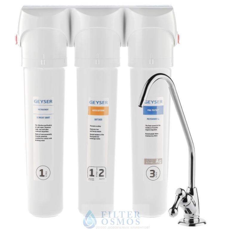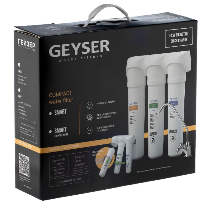 Компактная система Гейзер Смарт обеспечивает гарантированно высокую и эффективную степень очистки воды на протяжении всего срока службы. Благодаря сочетанию ионообменной смолы пищевого класса, а также кокосового активированного угля с добавкой серебра и материала Каталон, фильтр Гейзер Смарт удаляет все нежелательные загрязнения, умягчает воду и делает её безопасной и полезной для здоровья. Наличие быстросъемных фильтрующих модулей обеспечивает простоту и удобство обслуживания фильтра.