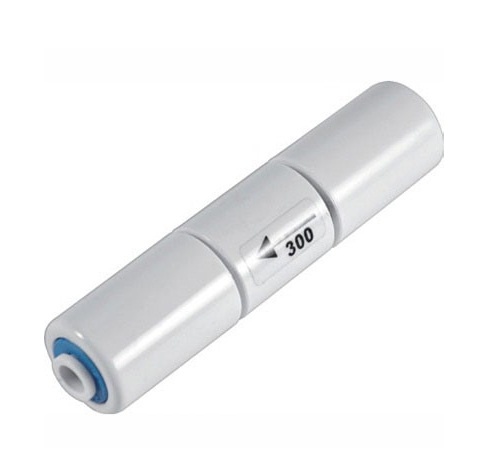 Ограничитель потока 300 мл/мин (300 сс) для систем обратного осмоса с мембраной на 50 галлон (50 G). Ограничитель потока является очень важным элементом в системе обратного осмоса. С помощью ограничителя потока происходит поддержание необходимого давления на обратноосмотической мембране. Правильно подобранный ограничитель потока является залогом эффективной и долговечной работы мембраны. Ограничитель потока нужно подбирать по пропускной способности для мембран с разной производительностью.Ограничитель потока требуется для того, чтобы создать внутри системы обратного осмоса давление, достаточное для прохождения фильтруемой воды сквозь мембрану.