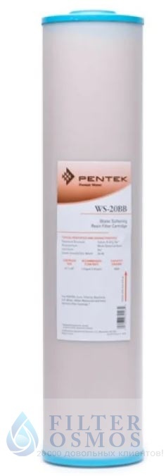 Pentek WS 20BB — это картридж для умягчения воды, устанавливаемый в магистральные фильтры Big Blue 20”. В качестве умягчающего компонента, в корпус картриджа засыпана катионообменная смола, которая поглощает соли жёсткости из проточной воды.